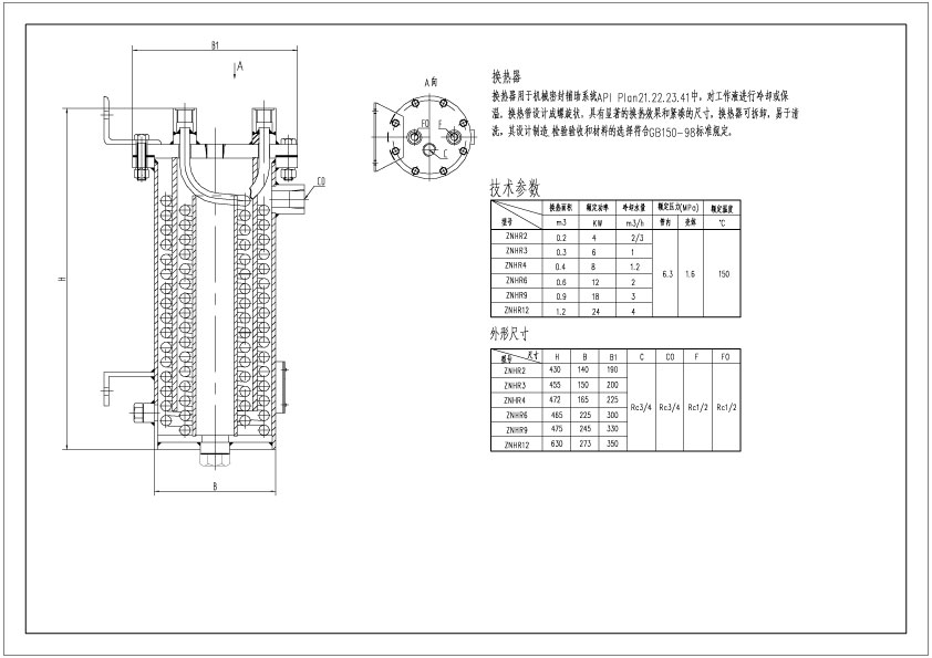 换热器用于机械密封辅助系统API Plan21.22.23.41中,对工作液进行冷却或保温,换热管设计成螺旋状,具有显著的换热效果和紧凑的尺寸。换热器可拆卸,易于清洗,其设计制造,检验验收和材料的选择符合GB150-98标准规定。